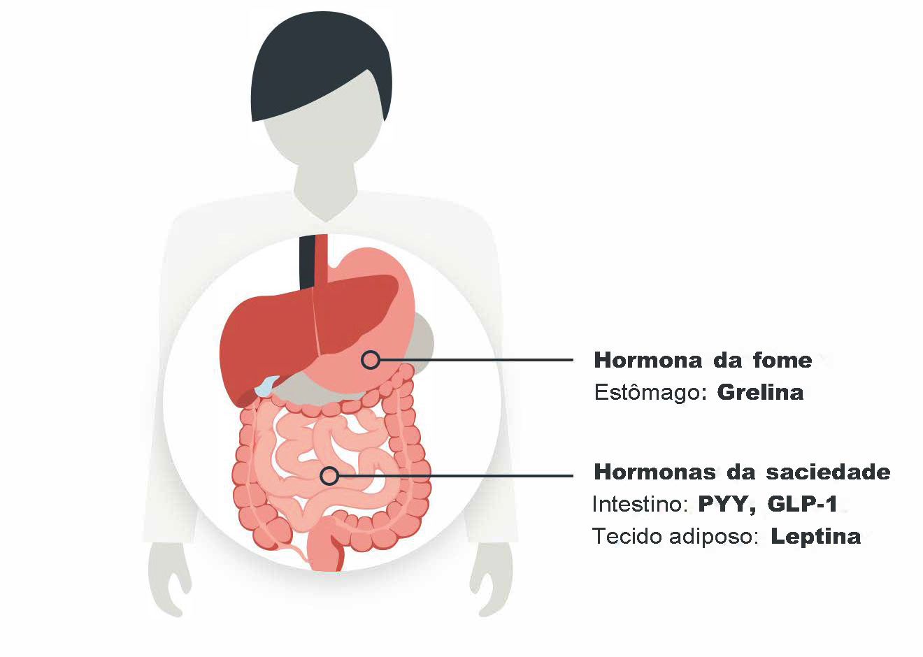 Estas hormonas circulam no sangue e vêm de tecidos em várias partes do corpo que gerem a ingestão e armazenamento de energia, incluindo o intestino (que recebe e digere os alimentos), o tecido adiposo (que armazena a energia sob a forma de gordura) e o pâncreas (que produz hormonas envolvidas no armazenamento de energia, como a insulina).